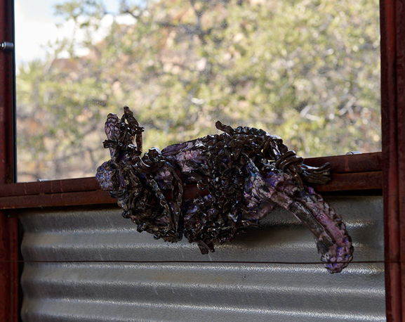 We are pleased to invite you to the group exhibition Mostly Thorns, featuring work by Hiroshi Clark, Lauren Goldenberg Longoria, and Liz Stringer. The exhibition will be on view from September 15 through October 5, 2025, with a reception weekend between Saturday, 9/27 and Sunday, 9/28, open 11am-6 pm daily. The exhibition will occur at the UCI Nature Burns Piñion Ridge Reserve, near Pioneertown, California, unceded Serrano and Cahuilla territory. Historically, this UC Irvine research site is home to ecological study and preservation of the very specific flora and fauna that meet at this site: the Transverse Range, Sonoran Desert, and the Mojave Desert. Acknowledging that art is research and process-driven, the exhibition aims to have both art and ecological study happening concurrently on the reserve site. All three artists had a hand in transforming the Burns Piñion Ridge Reserve’s Workshop into an arts space that can hold residencies and art exhibitions. Mostly Thorns is the debut exhibition in his newly transformed space. Mostly Thorns—is an exhibition loosely assembled under the ‘The Rose, Bud, Thorn’ framework—an exercise reflecting on three aspects of an experience: a Rose (a highlight, success, or positive moment), a Bud (a potential for growth, or something to look forward to), and a Thorn (a challenge, disappointment, or area needing improvement). When applied to each participating artist, this exercise examines the fraught intersection between materialism and the psychological terrains of various bodies (architectural, human, environmental). The work in this exhibition intersects through diverse strategies of making as each artist examines the friction between damage and repair occurring within various states of transformation and growth.